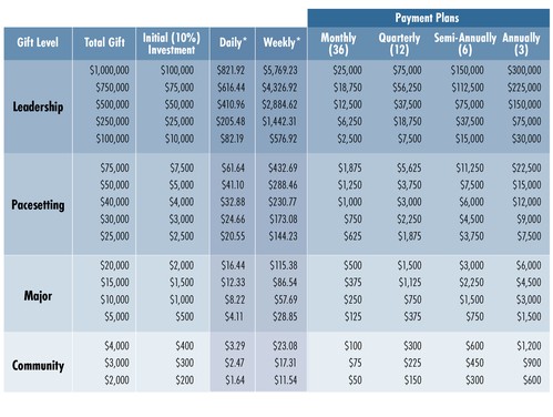 Long-Term Pledges are gifts payable over three years. Gifts may be paid in monthly, quarterly, semi-annual, or annual installments via cash, credit card, or direct deposit. We request an initial investment of 10% or more.